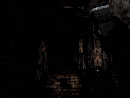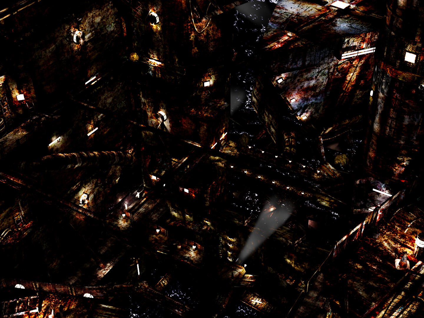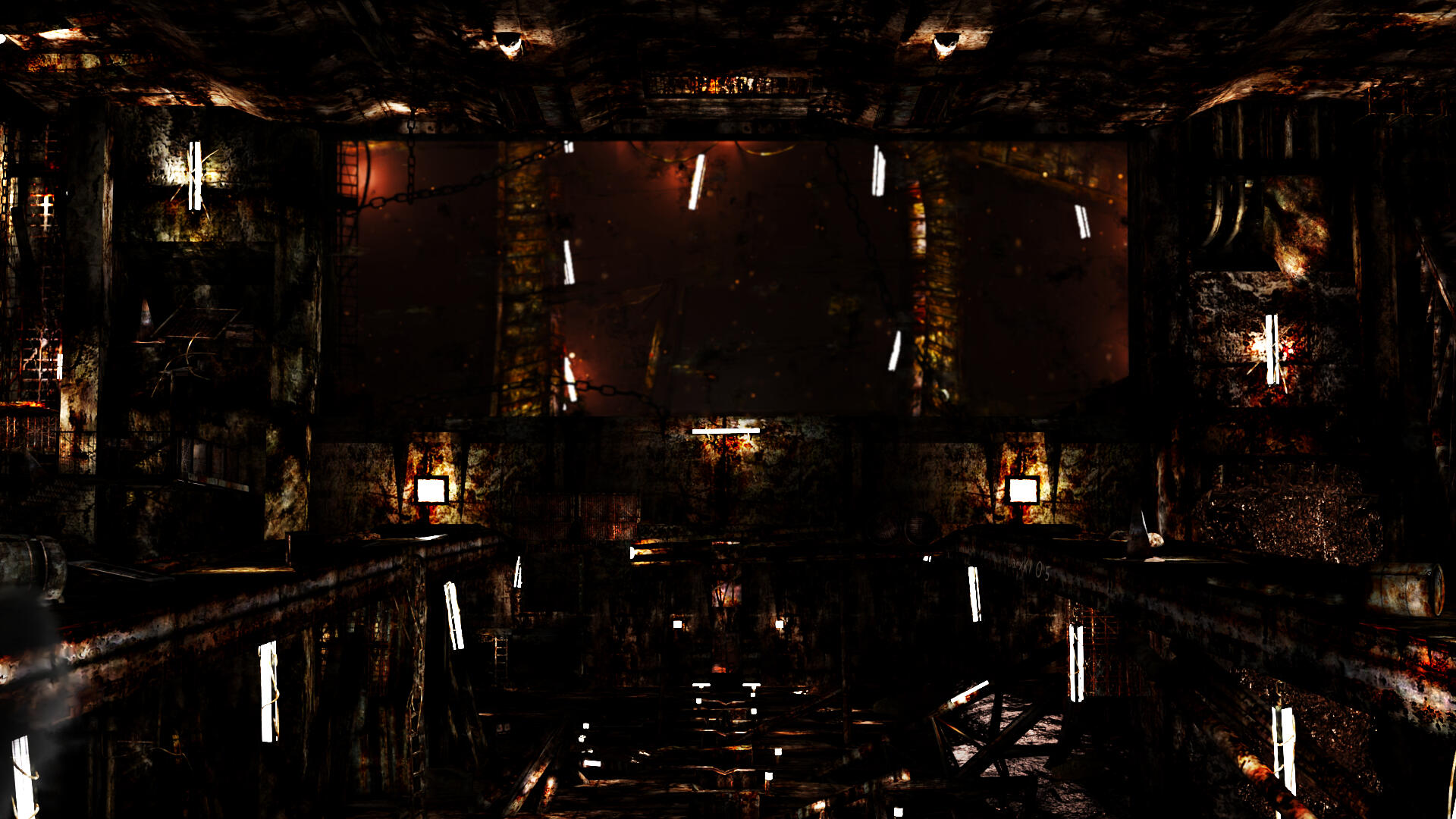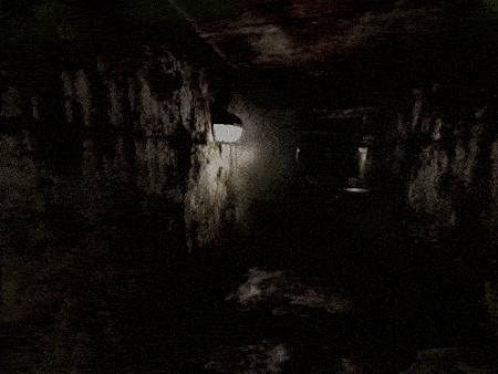A corrupted morgue, with a long path connecting its entrance with the rest of the building, and an outside area out of reach. Many moving conveyors are used for transportation, and they extend vertically throughout the whole structure. Outside, the night sky is covered in fog, and the trees are the only element that stand out by their color