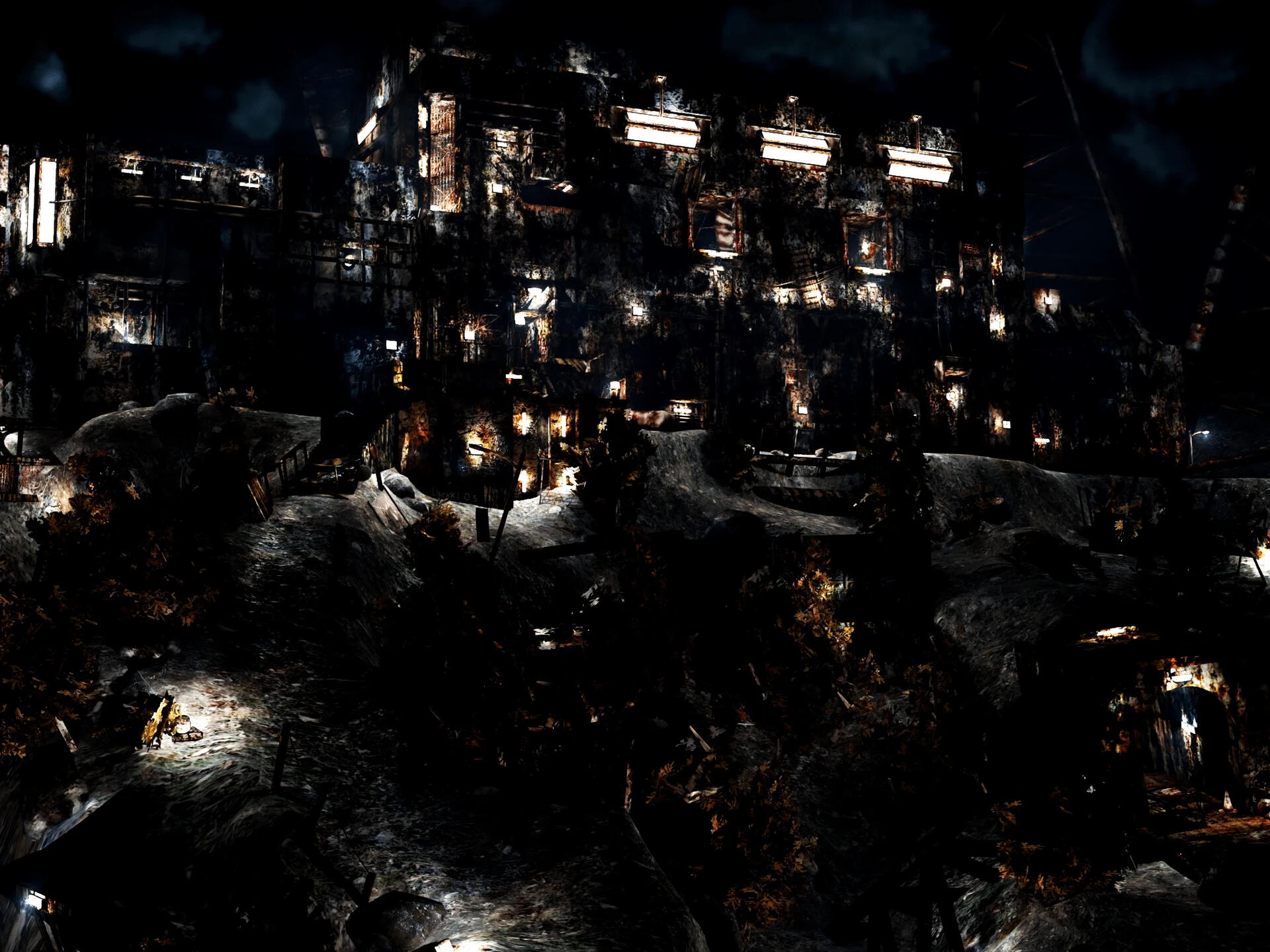 On top of a mountain, and guided by a dirt path on the side, a huge brutalist structure with rotten walls and emerging structures covers the cloudy night sky. Trees obscure the rest of the mountain, which is inaccessible by the unstable and darkened terrain the morgue lies on top of.