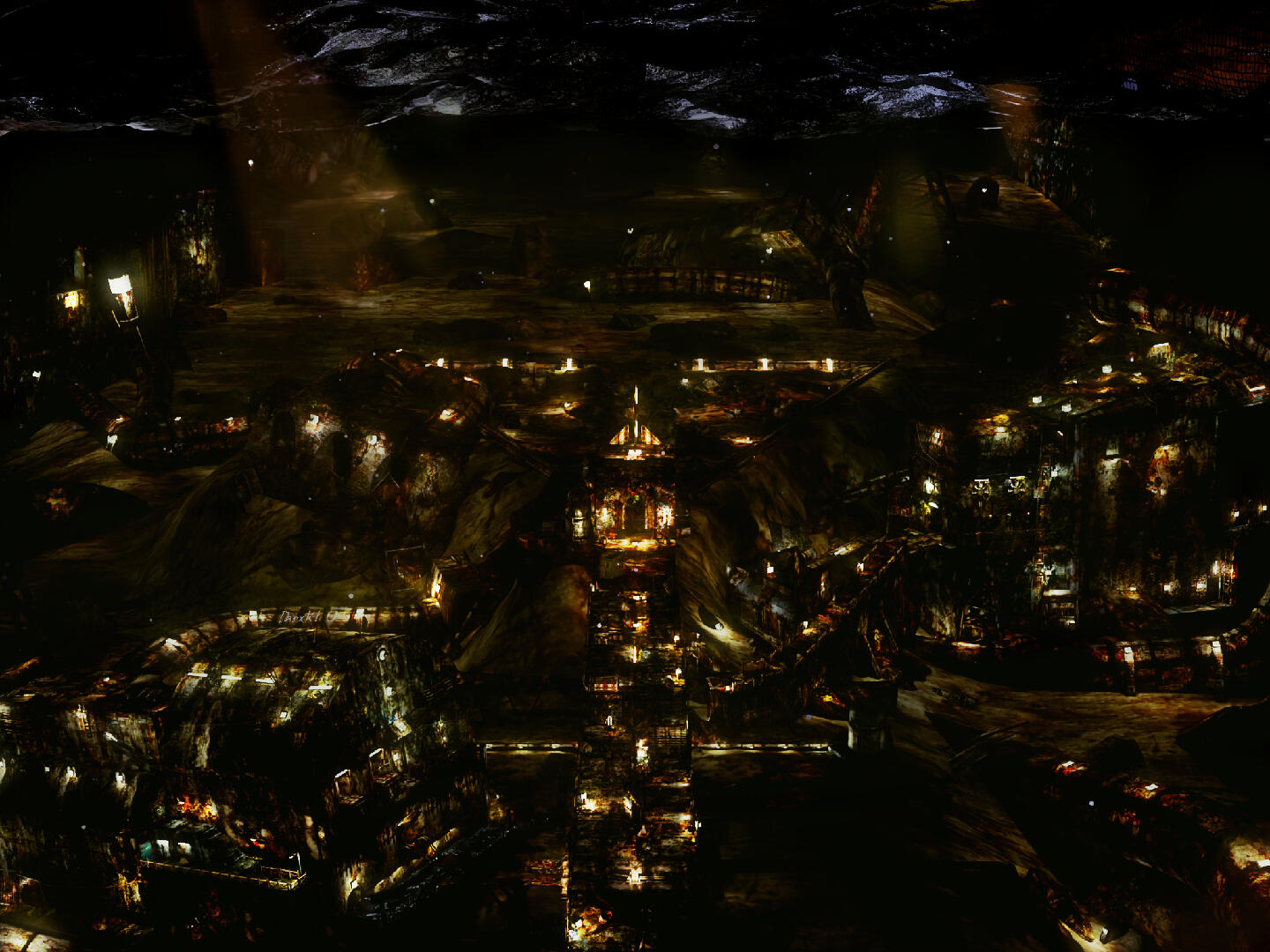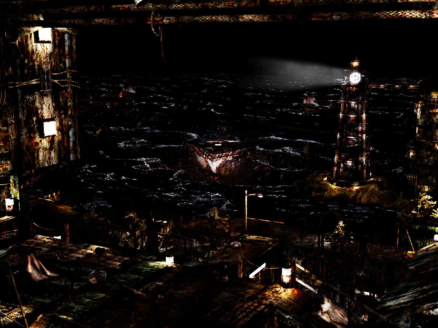 With the sea on top, a complex structure with multiple buildings and paths lies underwater. The main path, connected to huge indoor locations, eventually ends at an open room at the center of the artwork, elevated from the rest of the rusted, metallic and hazardous scenery. The influence of the structures extends even further, with multiple pipes and broken walls lying on the sea sand